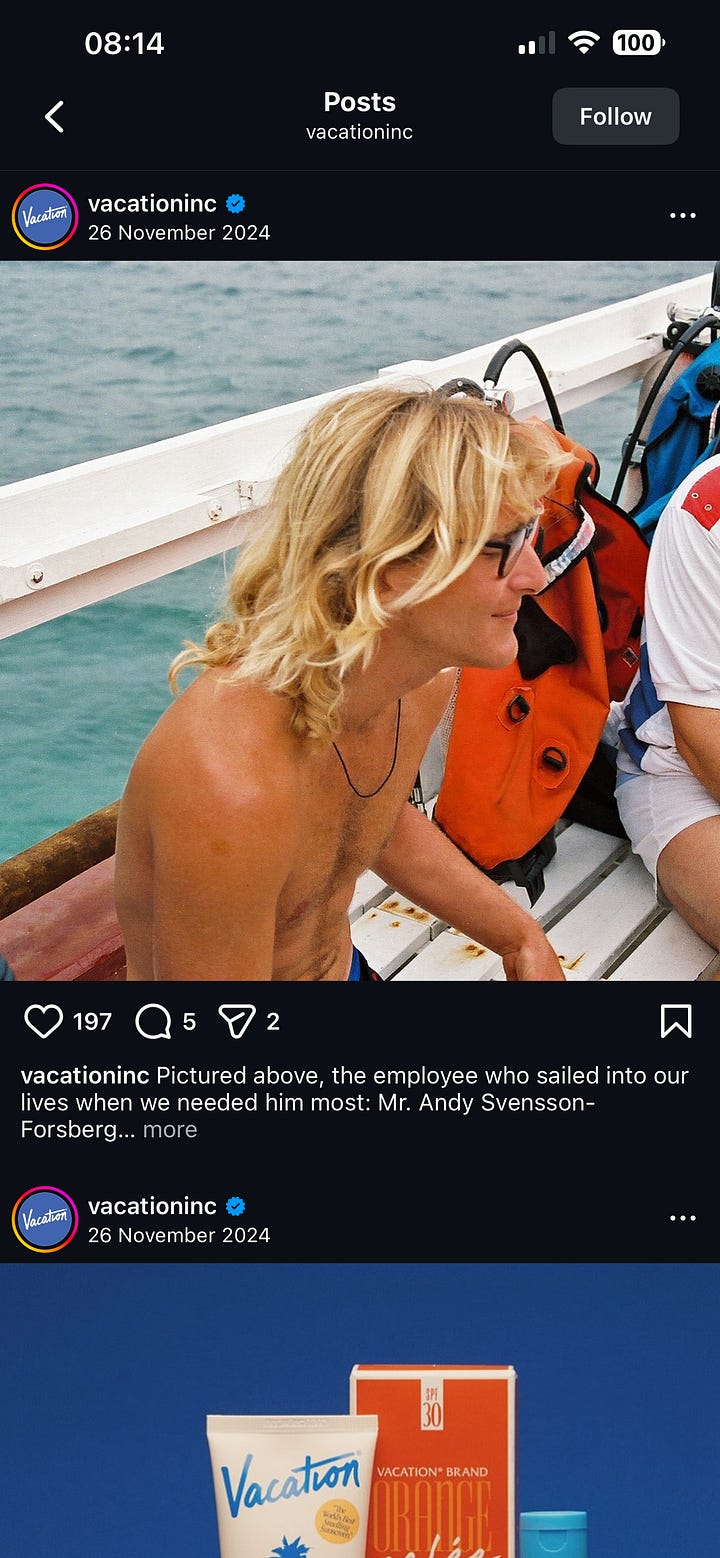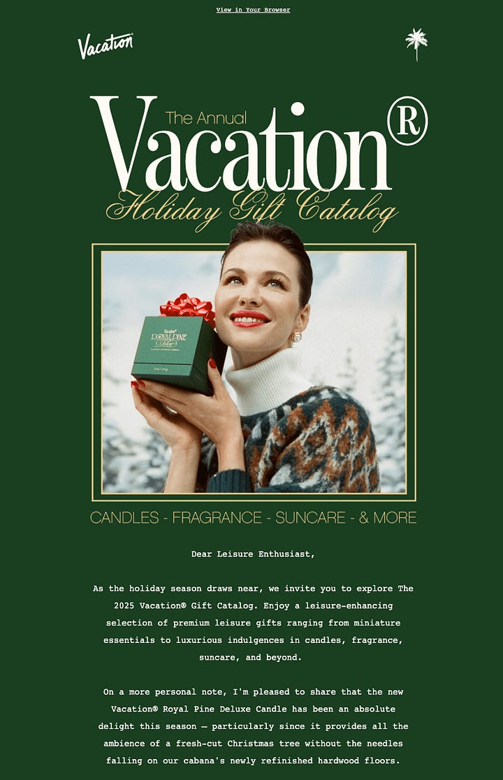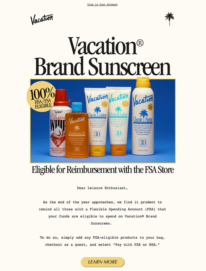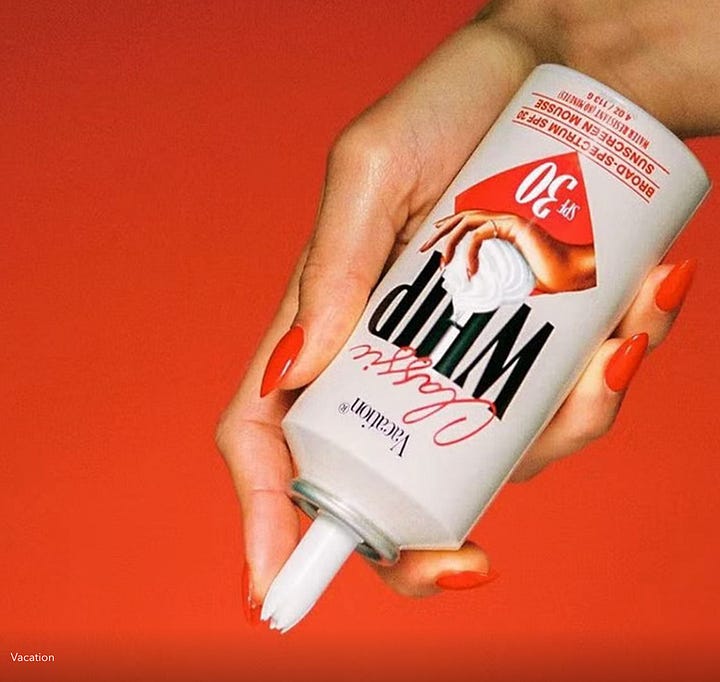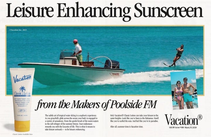 Vacation is a Miami-founded fictional universe created to sell premium lifestyle and leisure products. Think chic beachwear, home goods, and getaway experiences. They’ve managed to position sunscreen as a fun accessory, moving away from the clinical, functional way the category has traditionally been marketed.